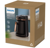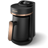 برای نمایش وضعیت، دستگاه از چراغ اعلام وضعیت استفاده میکند که روشن یا خاموش بودن و حالتهای مختلف عملکرد را نشان میدهد. علاوه بر آن، هشدار صوتی پایان فرآیند دمآوری را به کاربر اطلاع میدهد؛ بنابراین حتی اگر در حین تهیه قهوه در فاصلهای از دستگاه باشید، متوجه آمادهشدن نوشیدنی خواهید شد. از نظر کنترل، دکمه لمسی روی بدنه امکان شروع یا توقف فرآیند را با تنها یک لمس فراهم میکند. این دکمه با پاسخ سریع و طراحی ظریف، حس مدرنیته را به تجربه کاربری اضافه کرده است. این مدل مخصوص قهوه ترک طراحی شده و فرآیند حرارتی آن بهگونهای مهندسی شده که با افزایش دما بهتدریج، کف و غلظت مطلوب این نوشیدنی سنتی ایجاد شود. توان ۷۳۵ وات موجب میشود که زمان دمآوری کوتاه اما کنترلشده باشد تا طعم قهوه حفظ شده و تلخی ناخواسته ایجاد نشود. استفاده از فیلتر دائمی در این فرآیند، علاوه بر عبور کامل عصاره قهوه، جلوگیری از ورود ذرات درشت به نوشیدنی را تضمین میکند. سادگی استفاده، یکی از برجستهترین ویژگیهای فیلیپس HDA150/62 است. کاربر تنها کافی است مخزن را پر کرده، پودر قهوه ترک را داخل فیلتر قرار دهد و قوری را مهیا کند. با فشردن دکمه لمسی، دستگاه تمام مراحل را تا دمآوری کامل انجام میدهد. چراغ وضعیت و هشدار صوتی نیز به شما کمک میکنند بدون نگرانی و نیاز به نظارت مداوم، قهوهای دقیقاً مطابق انتظار تهیه کنید. طول کابل ۸۰ سانتیمتر انعطافپذیری مناسبی در جانمایی دستگاه روی میز یا اوپن آشپزخانه فراهم میکند.