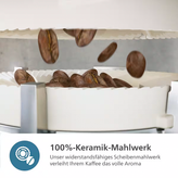 قهوه ساز فیلیپس مدل Ep5144 حالت آسیاب متفاوت دارد که به شما کمک میکند هر نوشیدنی را با درصد آسیاب مختص به خود درست کنید. مخزن 275 گرمی با جنس سرامیکی در بالای دستگاه به شما این امکان را میدهد که حجم قابل توجهی از قهوه را درون آن نگه دارید. قابلیت تنظیم آروما یا گرماژ قهوه در قهوه ساز فیلیپس کمک میکند غلظت قهوه را با کم و زیاد کردن میزان پودر آن تعیین کنید. اگر میخواهید با دوست خود قهوه میل نمایید ولی تا به امروز این امکان به دلیل وقت گرفتن هر فنجان قهوه میسر نشده، قهوه ساز کوچک فیلیپس برای شماست. اسپرسو ساز فیلیپس مدل Ep5144 دارای دو نازل خروجی قهوه است که امکان آماده کردن دو فنجان قهوه در کنار هم را برایتان فراهم میکند. خوب است بدانید این محصول دارای برنامه سنجش سختی آب برای جلوگیری از رسوب در دستگاه است. هم چنین شما می توانید دمای قهوه را نیز تنظیم کنید و از دو برنامه نظافت دستگاه برای تمیز کردن آن بهره ببرید.